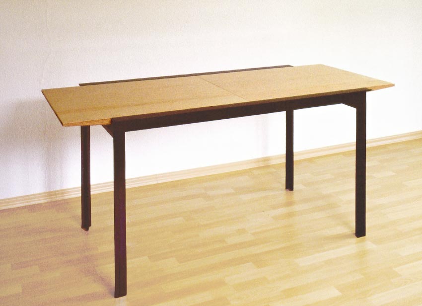 ausziehbarer Esstisch, Gestell in Stahl lakiert, Tischblätter in Holz Birke
